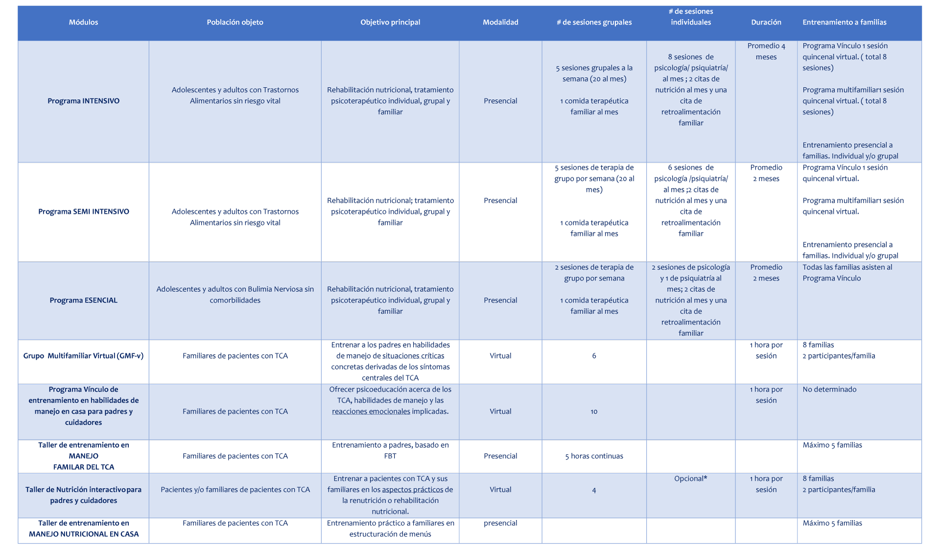 Para los trastornos de alimentación, ofrecemos paquetes de tratamiento que incluyen terapia individual psiquiátrica y psicológica, así como grupos terapéuticos, comidas terapéuticas familiares, entrenamiento a padres, asesoría nutricional particular y grupal a pacientes y familiares y diseño de planes de alimentación personalizados. Un elemento esencial, y que nos, caracteriza es la inclusión de las familias de manera activa en el tratamiento, a través de grupos virtuales, comidas terapéuticas familiares y entrenamientos presenciales basados en los principios de Family Based Therapy ( FBT).
